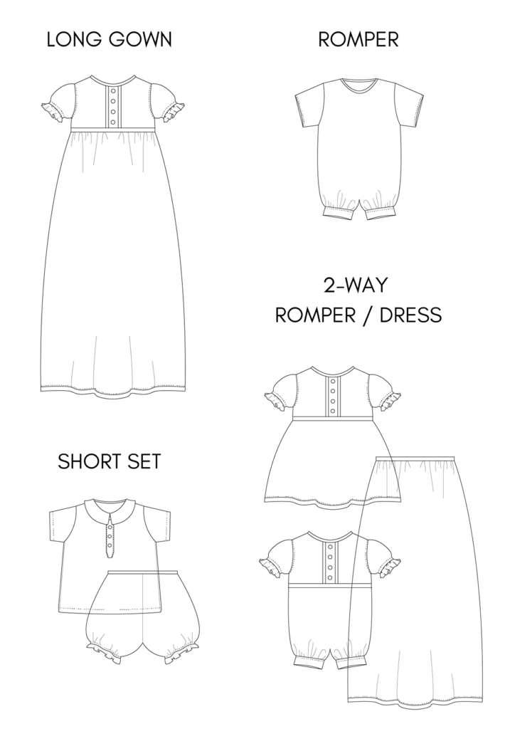 For girls, we have the classic long gown and 2-way dress style that features a removable long skirt. For boys, we have the romper, 2-piece shorts set and 2-way romper styles.