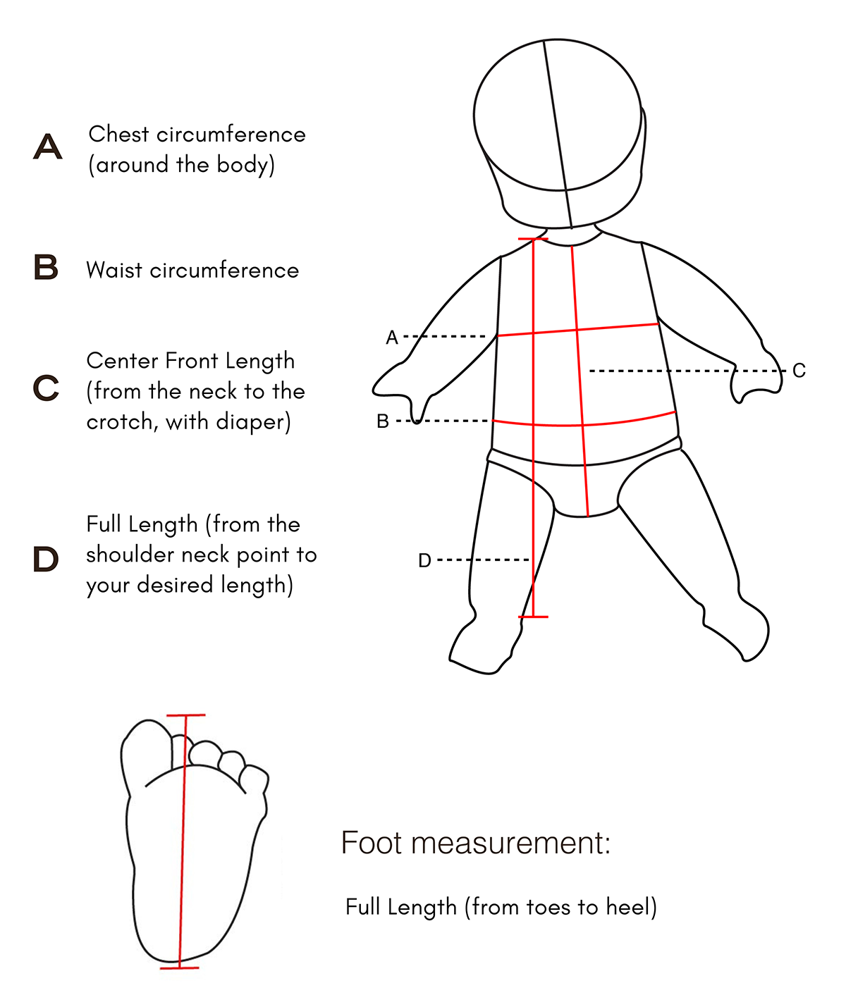 To make sure that your baby’s baptismal gown will fit right, please take time to go through the different measurement and sizing guides below: